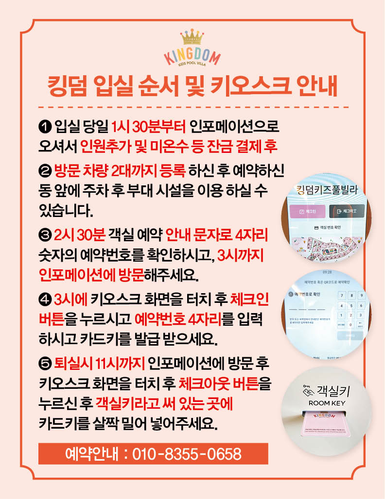 5. 퇴실시 11시까지 인포메이션에 방문 후 키오스크 화면을 터치 후 체크아웃 버튼을 누르신 후